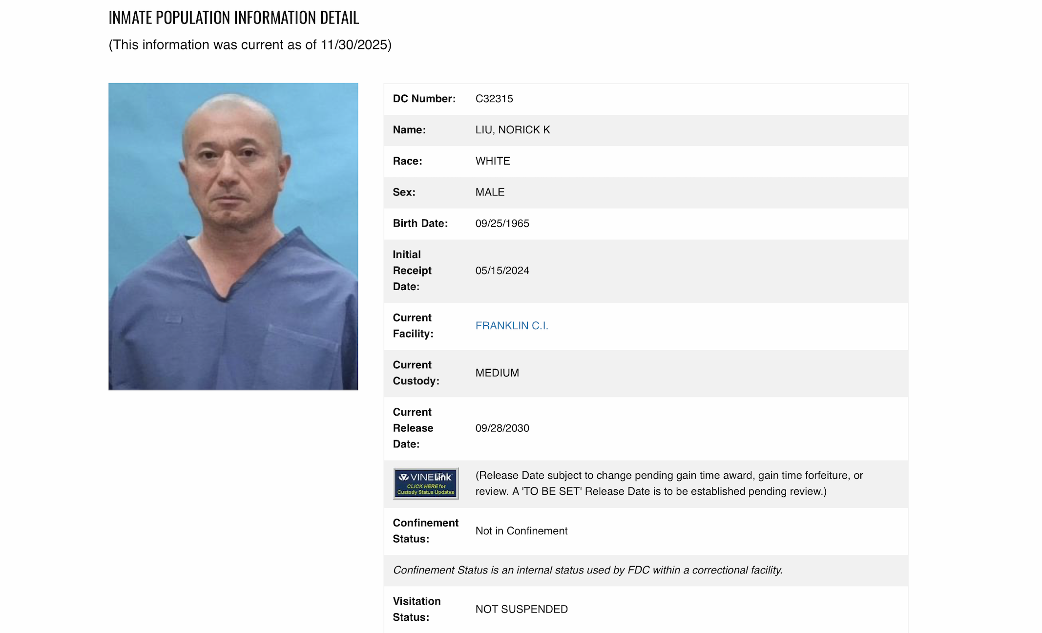 Liu is housed in the Franklin Correctional Institute.