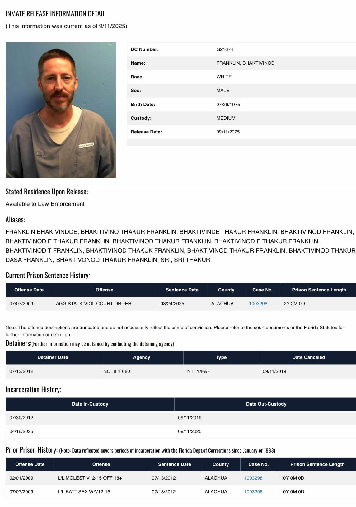 Update | April 2, 2026: Bhaktivinode Franklin, 50, served a few months in prison in 2025 following his fourth probation violation arrest. His probation was revoked at sentencing, court records show.