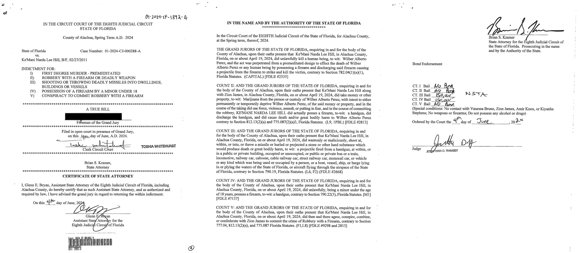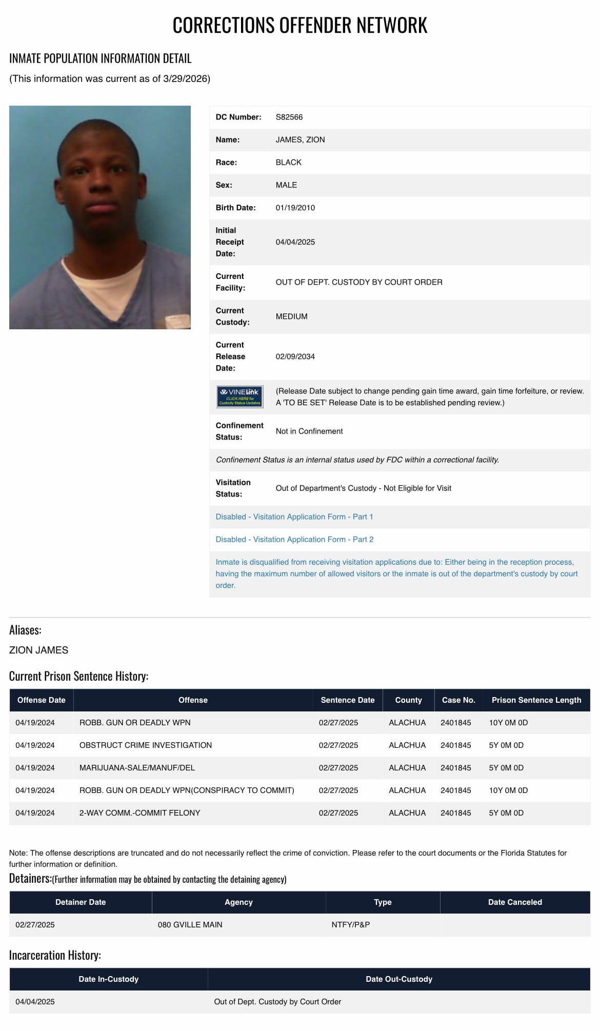 According to the Florida Department of Corrections website, James, now 16-years-old, is "out of custody by court order." The local booking log shows he is in the Alachua County Jail, indicating prosecutors intend to call him as a witness in Hill's trial.