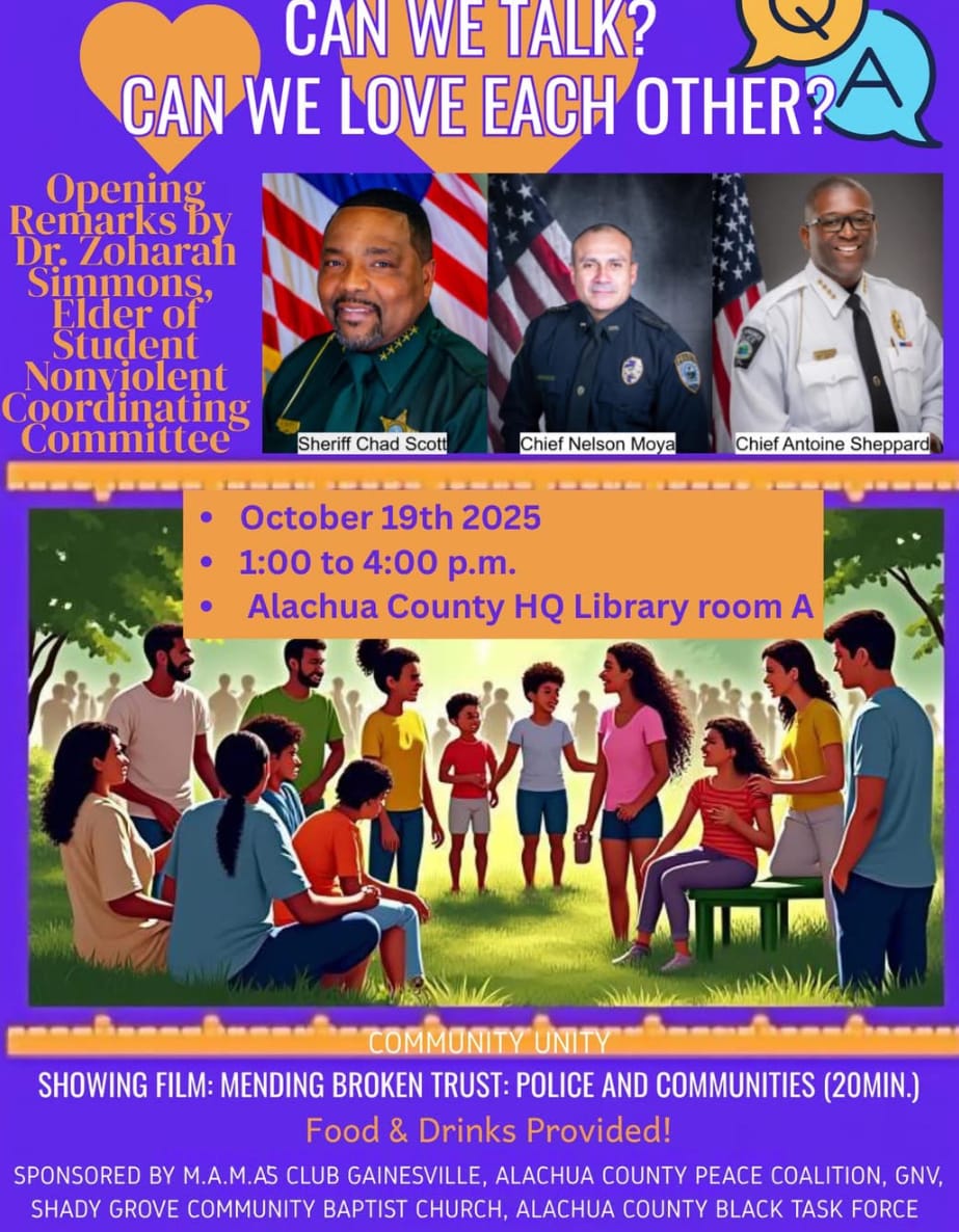 Attendees of the event will hear from Alachua County Sheriff Chad Scott, High Springs Police Department (HSPD) Chief Antoine Sheppard and Gainesville Police Department (GPD) Chief Nelson Moya.