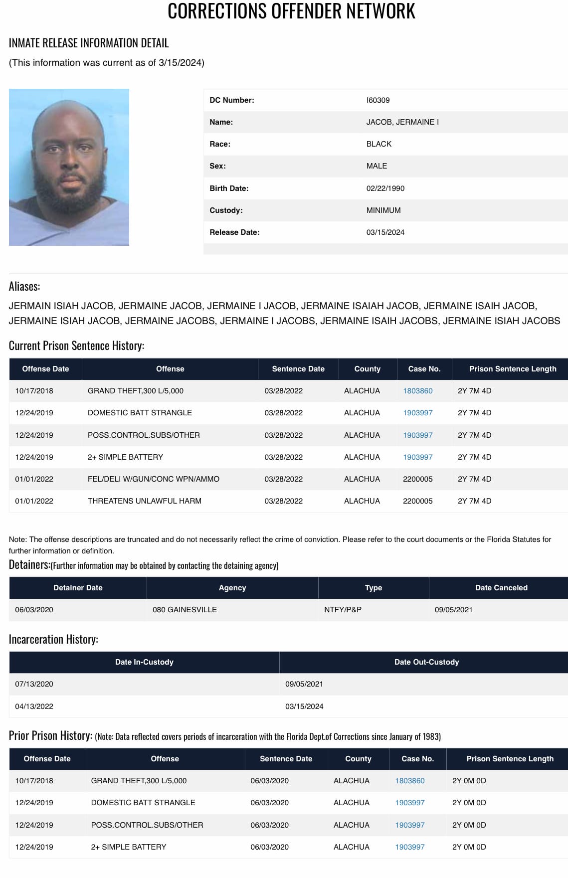 On February 22, 2026, Alachua County Sheriff’s Office (ACSO) deputies arrested Jermaine Isiah Jacob, 36, and charged him felony battery. The battery was charged as a felony due to his prior battery convictions. The arrest report shows the incident occurred on Jacob’s birthday.