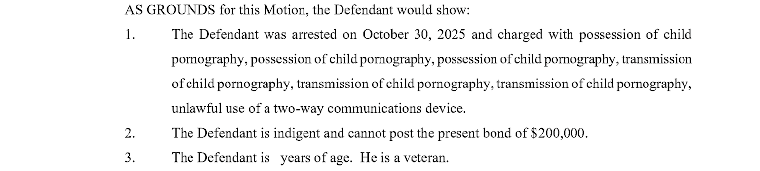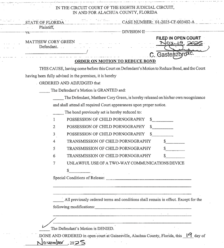 On November 12, Matthew Cory Green, 56, motioned to reduce his bond of $200,000 for his three counts of possessing and three counts of digitally transmitting child sexual abuse material, in addition to a count of using a two-way communication device to facilitate a felony.