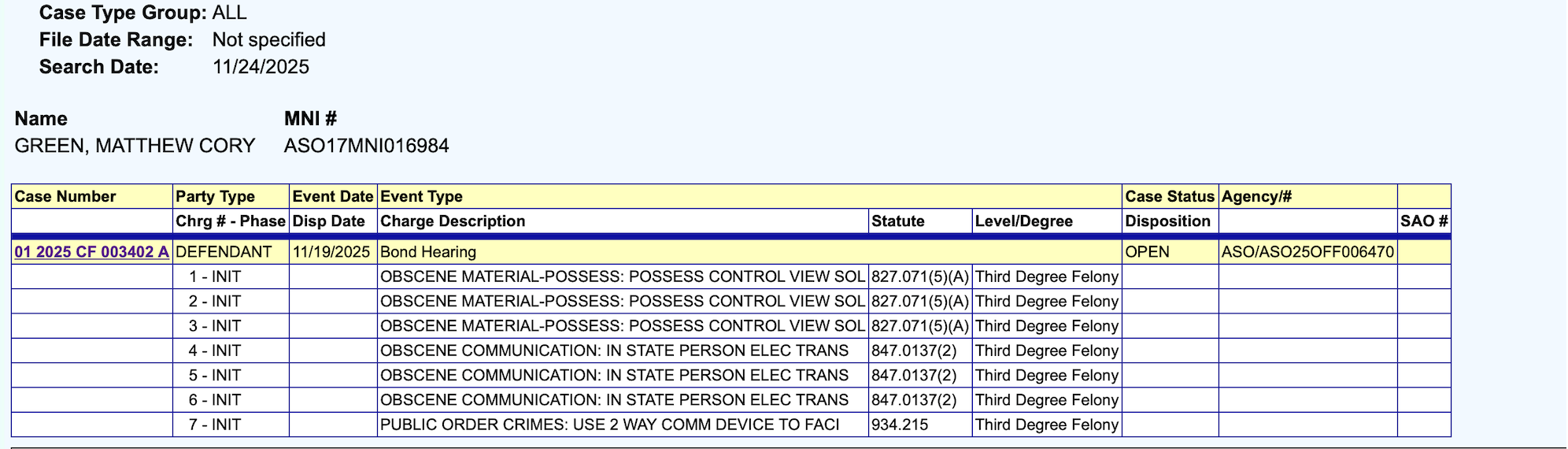 The press release states, “Through detailed digital investigative methods, Detective Dawson was able to identify the suspect as 56-year-old Matthew Green, a resident of Newberry, Florida. After confirming Green’s residence on SW 15th Avenue, located near Newberry Elementary School, Detective Dawson obtained a search warrant for the property… Although Green’s residence is in close proximity to a local school, at this stage of the investigation there is no evidence indicating that he had any physical contact or direct involvement with students in the area. This remains an active and ongoing investigation, and additional charges may be forthcoming. No further information will be released at this time to protect the integrity of the case.”