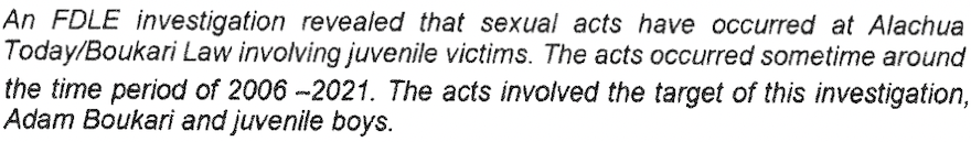 Last year, Boukari’s brother, Adam Boukari, faced public scrutiny following the release of a Florida Department of Law Enforcement (FDLE) memorandum which contained allegations that he committed sexual abuse against minor boys at Alachua County Today/Boukari Law, PA.