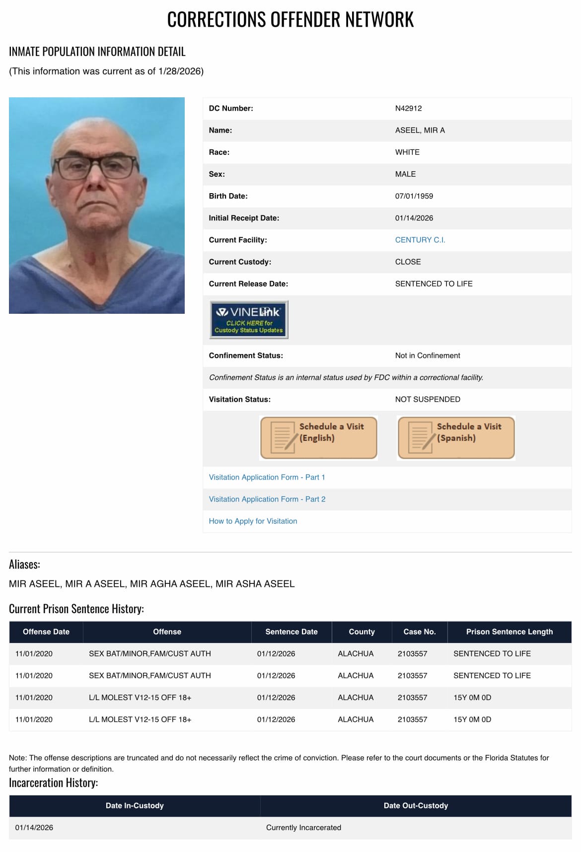 Mir Aseel, 66 was recently transferred from the Florida Department of Corrections (FDC) Reception and Medical Center to the Century Correctional Institute where he will reside for the rest of his life.