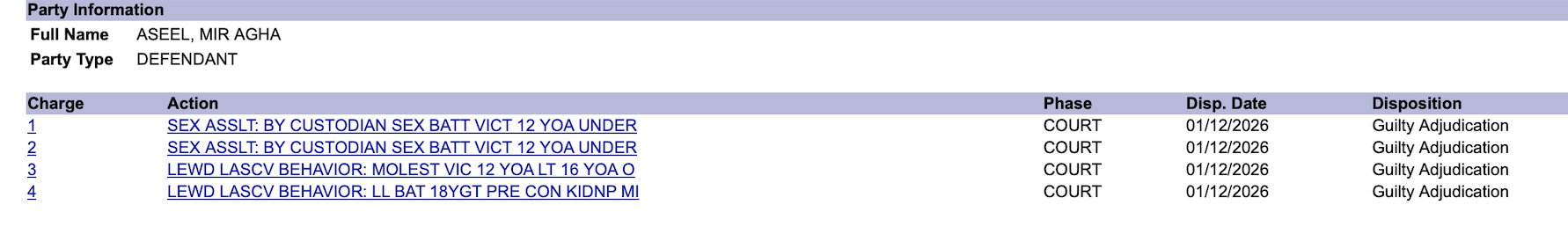 On January 12, 2026, Aseel was sentenced to life in prison following a trial conviction of four child sexual abuse charges.