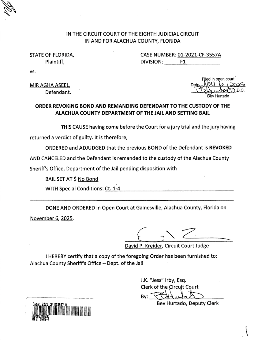 Aseel took his case to trial on November 3, 2025. After three days of proceedings, a jury found him guilty on all counts. Aseel’s bond was subsequently revoked, and he was placed into custody of the Alachua County Jail pending a pre-sentence investigation.