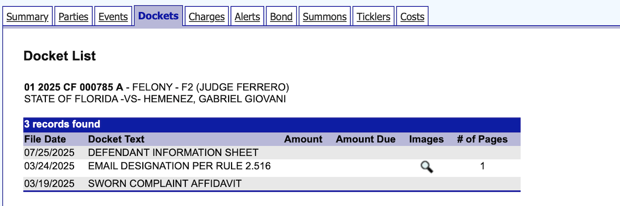 From March through June 2025, the only dockets on Hemenez's case file were his police report and a routine attorney email designation.
