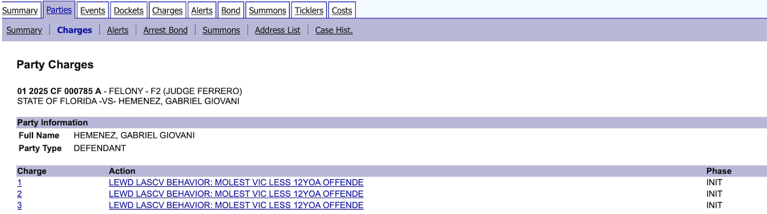 Gabriel Hemenez, who is serving a five-year prison sentence after taking a no-contest plea deal on child molestation charges, is currently under a detainer issued by the Alachua County Sheriff’s Office (ACSO).