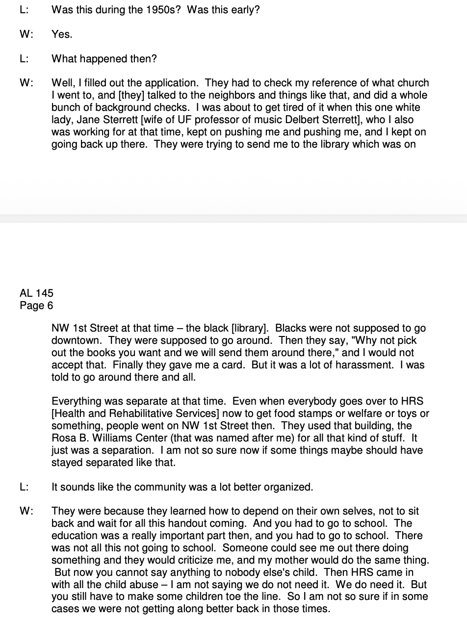 GnvInfo asked the City of Gainesville Public Information Office about the discrepancy, prompting Communications Director Jennifer Smart to check the transcripts from Williams' interviews dating back to 1983 and 1992 with the Samuel Proctor Oral History Program at the University of Florida (UF). The transcripts showed she did in-fact obtain her library card in the 1950s.