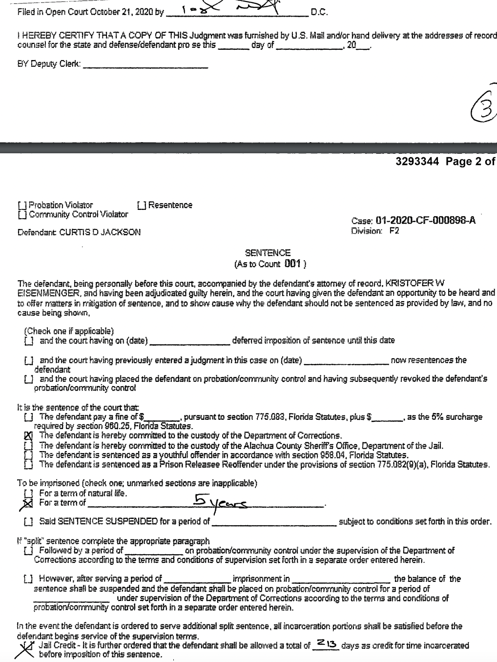 On October 21, 2020, Jackson was sentenced to five years in prison with 213 days time served. Jackson was scheduled to be released in March 2025 but was instead released in June 2024.