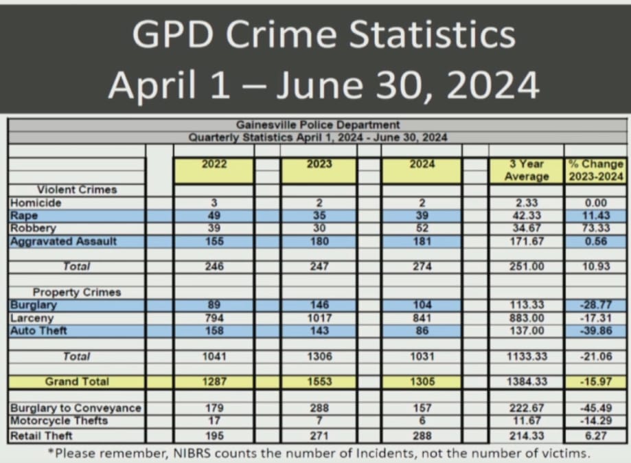 On August 1, the Gainesville Police Department (GPD) gave their quarterly update to the Gainesville City Commission for April-June 2024.