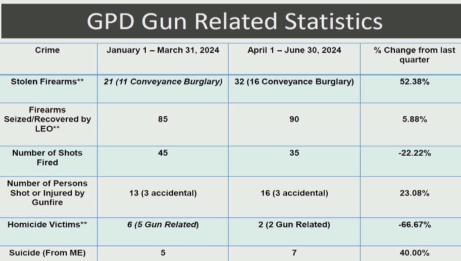 GPD Interim Police Chief Nelson Moya began the meeting showing GPD crime statistics for property crimes, violent crimes and gun-related crimes.