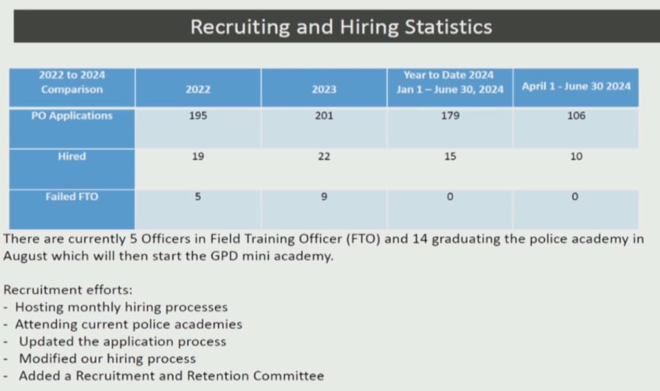 GPD has hired 15 officers total this year so far, with 10 in the past quarter. Kurnick clarified that the shown statistics were not updated and that one officer had recently failed out of the field training program.