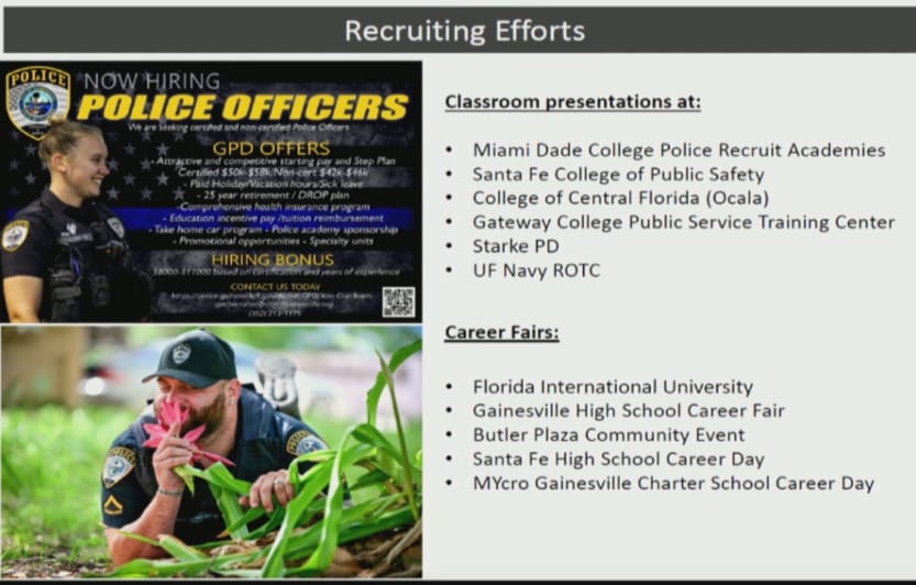 Kurnick went on to detail schools GPD has visited to assist recruiting efforts, including but not limited to Santa Fe High School, Santa Fe College, University of Florida Navy ROTC, and Gainesville High School.