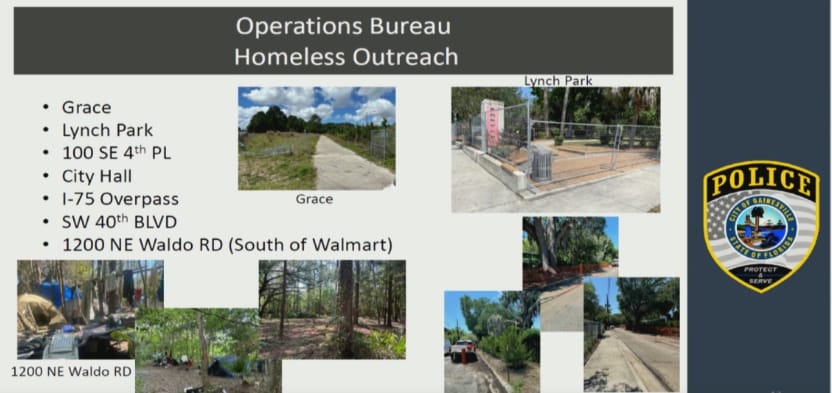 Young detailed GPD’s interactions with homeless Gainesville residents. “For our homeless outreach, this is one of our priorities that we have been dealing with as an agency across the city. You’ll notice the top picture says Grace [Marketplace], but that is actually the outside of Grace Marketplace…. That’s the far Eastern gate [and] I don’t know if you can tell, but it's been completely obliterated. It was secured at one point to keep people out, and that is something we’re constantly dealing with. I actually just came from there before coming here, going out with public works because we had to clean that entire area up. That includes securing the area and clearing some of the foliage around that conceals the individuals that are out there…. Lynch Park; again, heavy lifting by all city departments. We’re looking to get the word out and get education out as humanly as possible and as respectfully as possible to move individuals along and get them connected to services. [It’s] the same thing on SE 4th Pl, and we continue to monitor that every day to maintain and not just rest on what we’ve already done. [At] City Hall, we’ve had a lot of individuals complaining as well. A lot of it comes with education, like yes, this is a public building [but] there are hours where the facility itself is not opened, and that is not a place for people to set up and sleep…. The 1-75 overpass, most of that area is controlled by the Florida Department of Transportation so they go out there frequency to keep that area cleaned up and they work with our officers on a frequent basis to move individuals along. Most of those individuals are transient so they’re not fully aware…. On Southwest 40th Blvd, we have a trespass authorization on file now, [and] we’ve made contact with the property owner to make sure we don’t have any additional issues with people popping up to camp. The pictures that you see down at the bottom [on the left] is 1200 NE Waldo Road. It took several months and collaboration across multiple departments and resource connections with individuals out there and then a couple of arrests because they were necessary to get to where we are now.”