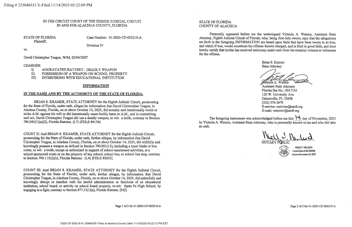 The attorney for 19-year-old David Teague, who was arrested in October 2025 for stabbing another student at Santa Fe High School, argued against his client's pretrial detention and shared information on video evidence he received, court documents show.