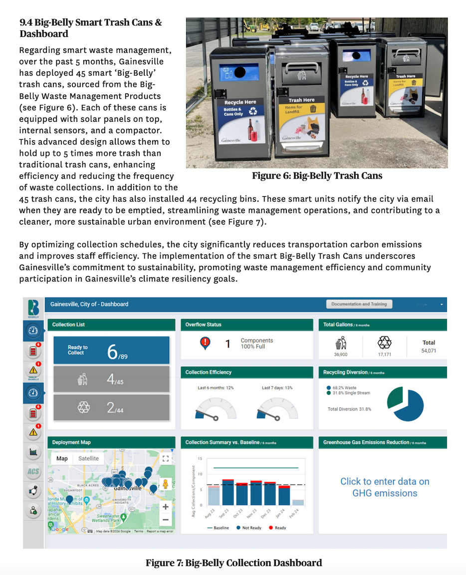 “Each of these cans is equipped with solar panels on top, internal sensors, and a compactor," the GCR Plan states. "This advanced design allows them to hold up to five times more trash than traditional trash cans, enhancing efficiency and reducing the frequency of waste collections... By optimizing collection schedules, the city significantly reduces transportation carbon emissions and improves staff efficiency. The implementation of the smart Big-Belly Trash Cans underscores Gainesville’s commitment to sustainability, promoting waste management efficiency and community participation in Gainesville’s climate resiliency goals.”