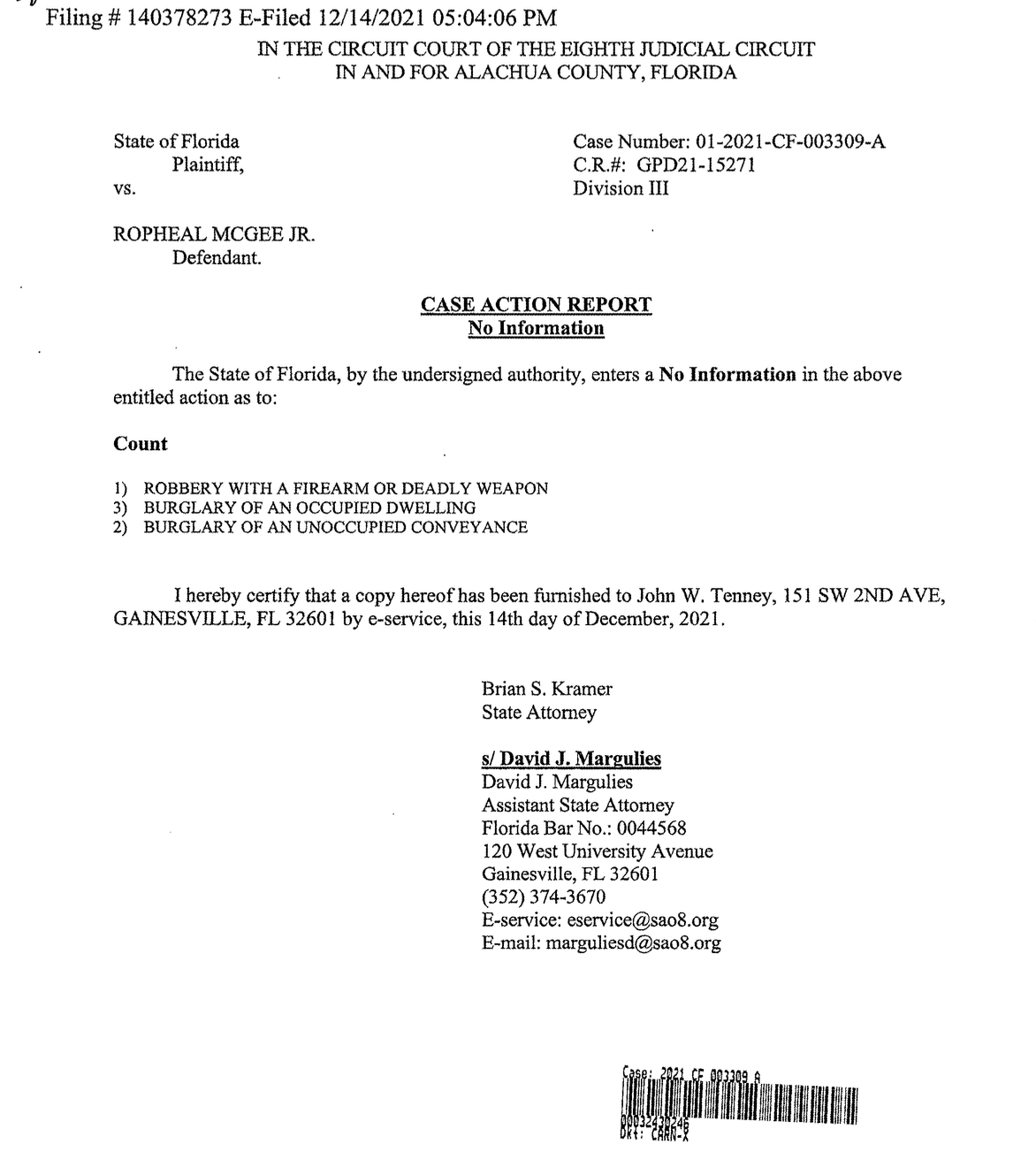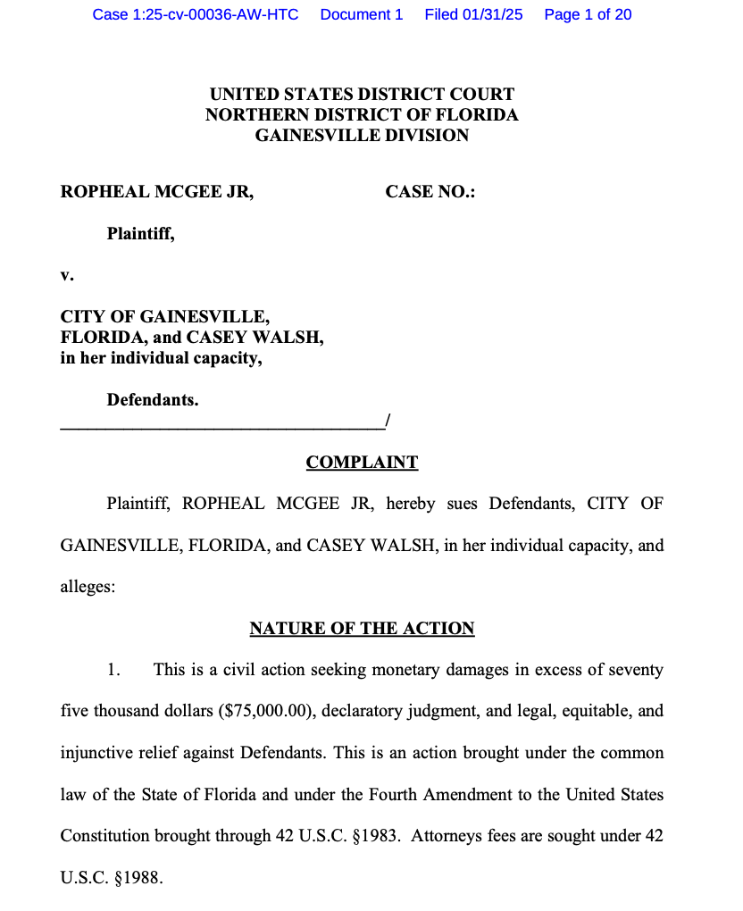 “A team of officers—including Officers Hickey, Milman, Walsh, and Sevor—initiated an attempt to apprehend McGee. According to the involved officers’ statements, an audible police announcement was made, which allegedly caused McGee to flee toward his apartment. However, the body-worn camera footage from the scene raises disputes regarding whether such a verbal announcement occurred. McGee was ultimately apprehended by K-9 Officer Walsh, whose K-9 partner, Stern, engaged and bit McGee. The K-9 maintained contact for an extended duration, resulting in significant injuries to McGee while he was on the ground… Following the apprehension, McGee was handcuffed with his hands in front due to the severity of his injuries and was immediately treated by Alachua County Fire Rescue. He was transported to UF Health Shands Hospital for medical evaluation and treatment. After release from the hospital, McGee was booked into the Alachua County Jail…