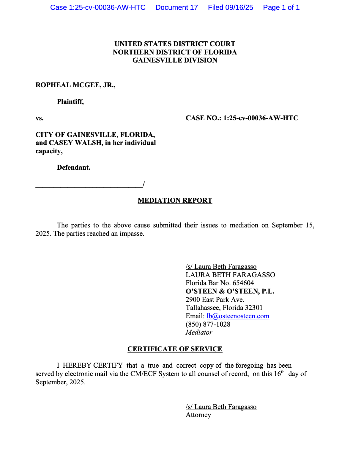 With counsel for McGee and the counsel for the defendants reaching an impasse during a mediation conference, they took the case to trial last week.