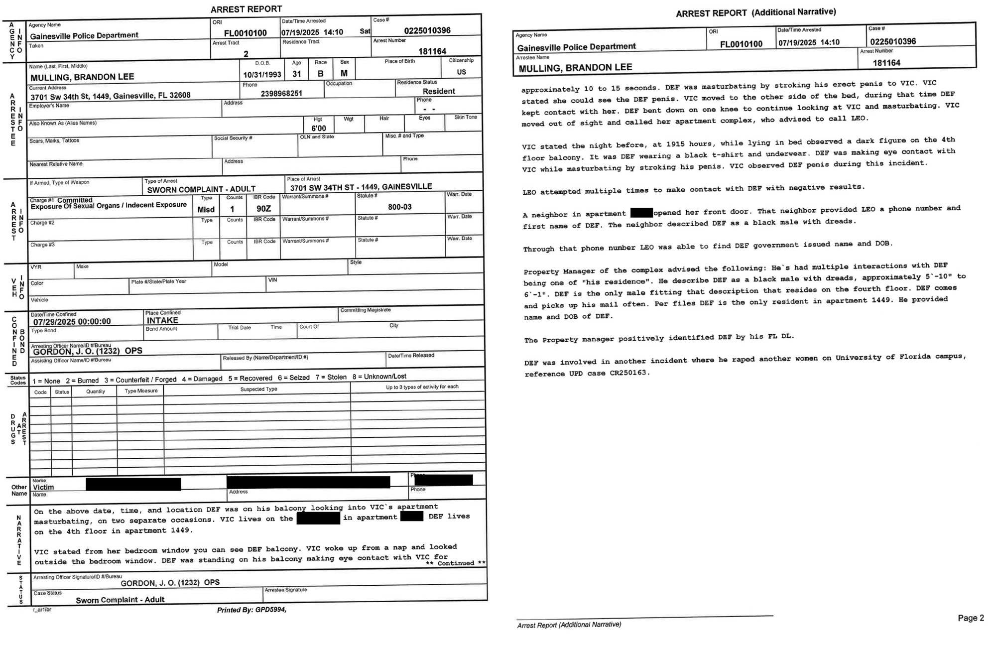 The victim explained to police that there is a visible line of sight between Mulling’s balcony and her window. She said that when she woke up from a nap, she observed Mulling and he made eye contact with her while committing the sexual offense. Even when she moved to the other side of her bed, Mulling reportedly bent down to continue looking at her while masturbating, prompting her to contact law enforcement. The victim said Mulling did the same thing the night before, looking at her while masturbating on his balcony.
