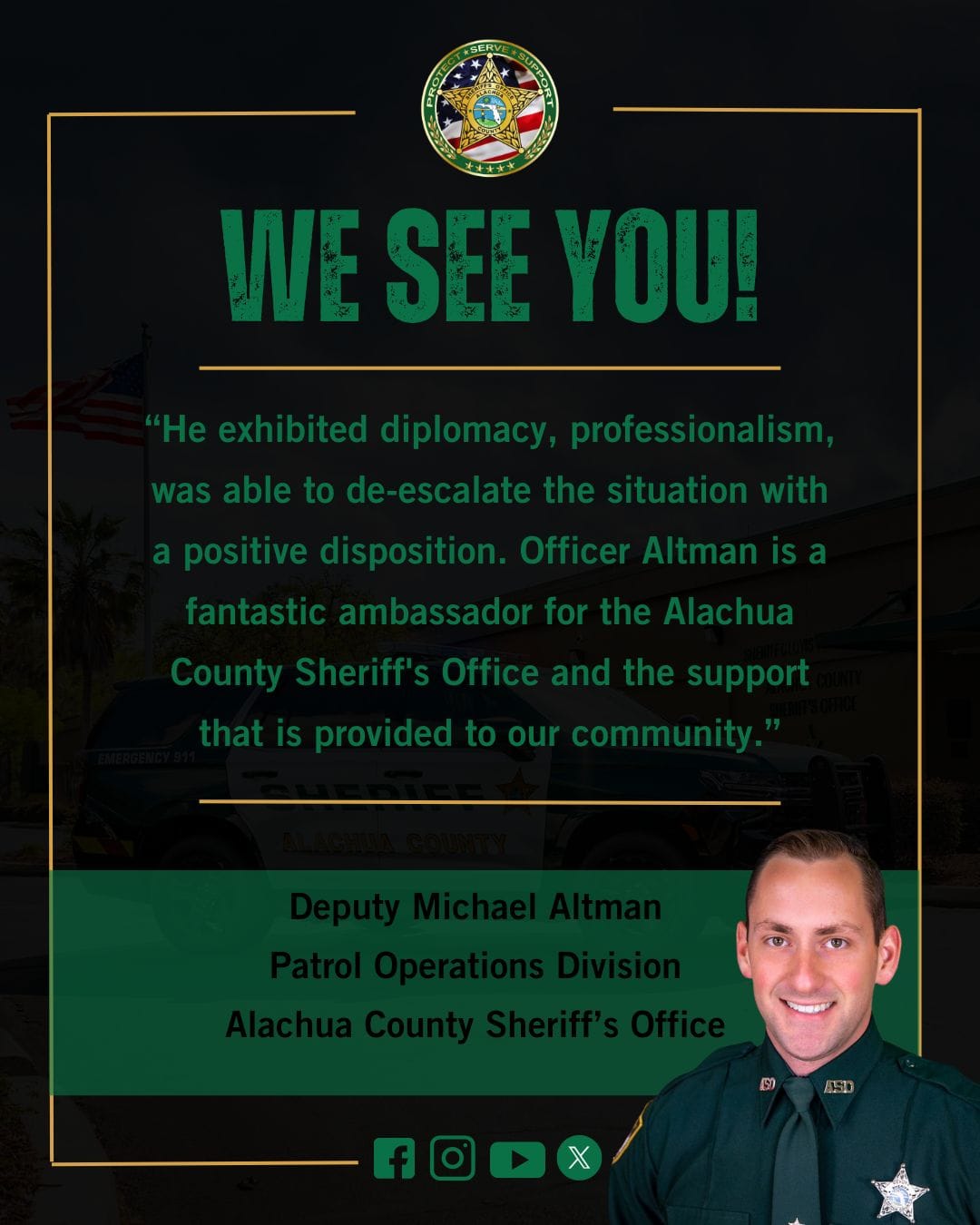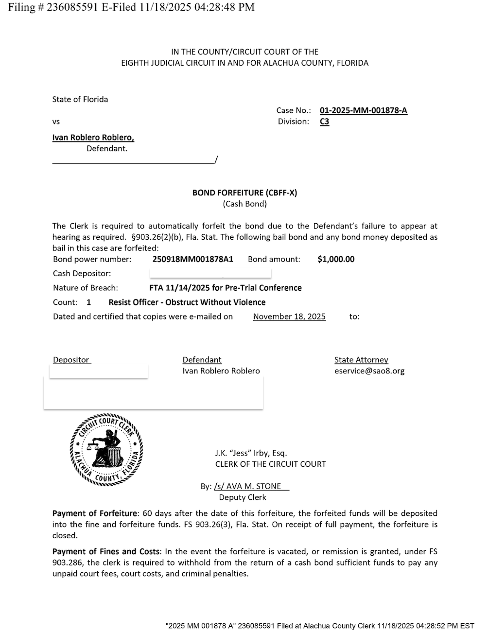 On November 17, 2025, ACSO Deputy Michael Altman physically assisted FHP Trooper David Hughes in arresting Ivan Roblero, who was charged with resisting an officer without violence.