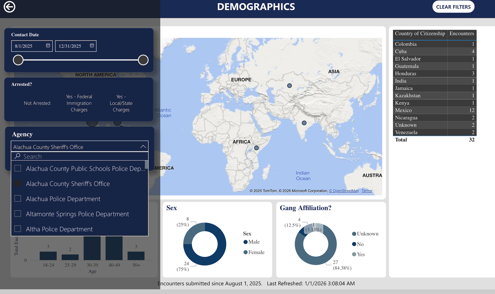 The data shows ACSO has had encounters with 32 suspected unauthorized immigrants. The data appears to regard encounters deputies have had directly within the context of their policing duties, and likely doesn’t count individuals booked into the ACSO jail for being in the country unlawfully or the number would be much higher. Many suspected unauthorized immigrants who were booked into the ACSO Jail throughout 2025 were arrested by the Florida Highway Patrol (FHP), not ACSO deputies themselves.