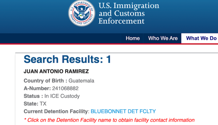 The ICE Detainee Locator indicates Ramirez was deported, as he previously showed as being in the Bluebonnet Detention Facility when searching his name, while currently no results are found upon searching his name or A-number.