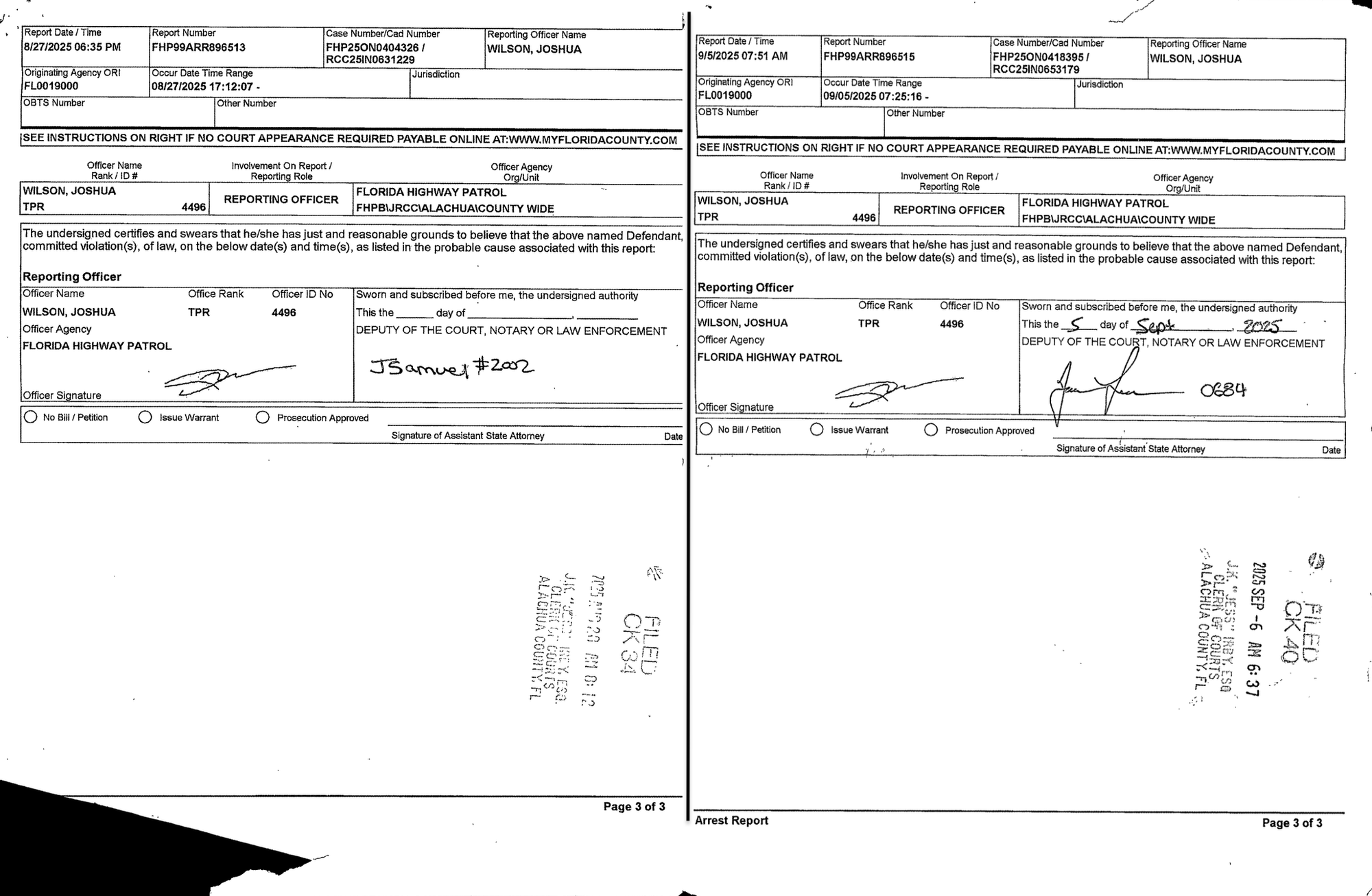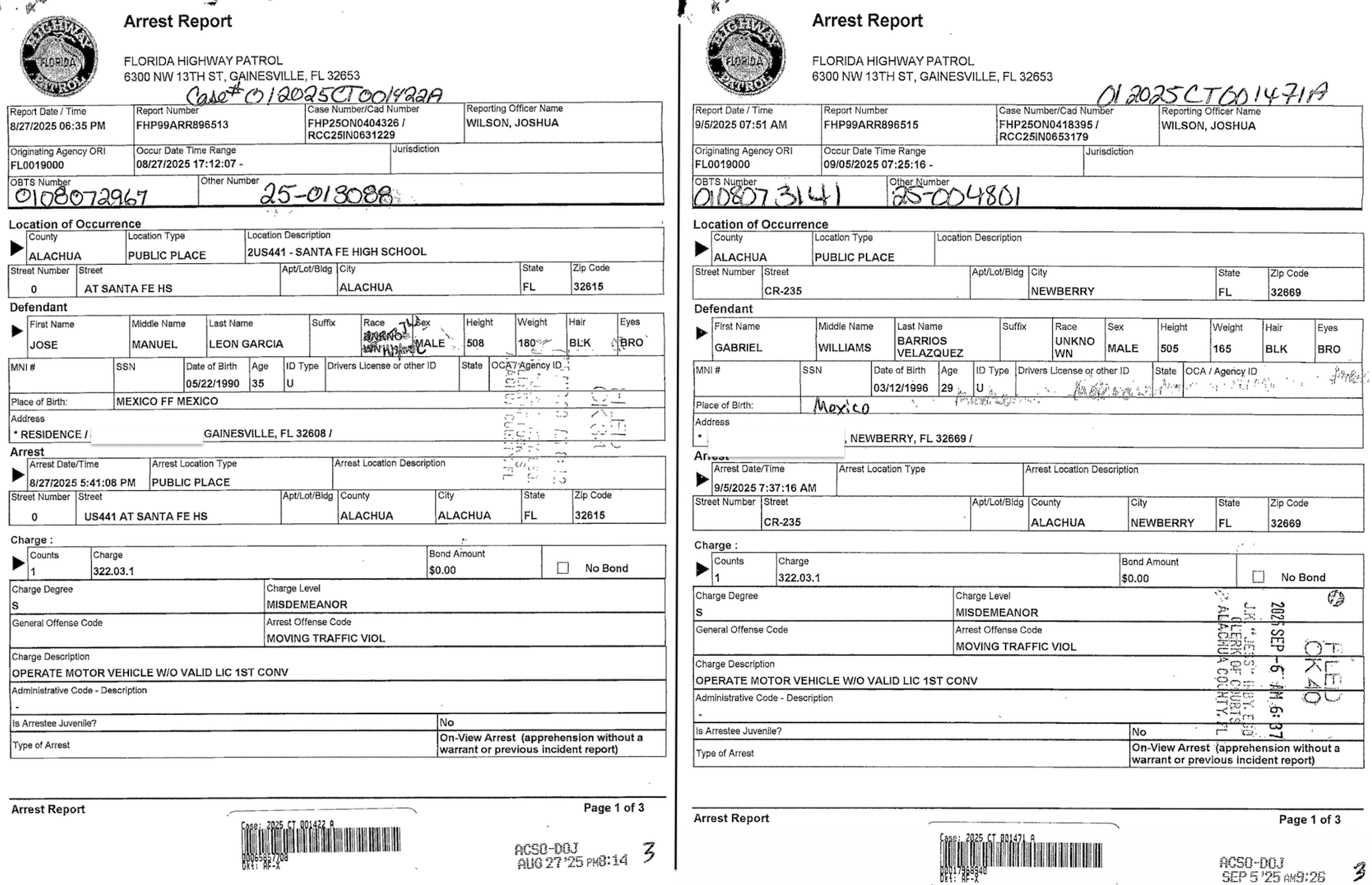 On March 28, 2025, UF student Felipe Zapata Velásquez was arrested by GPD officers Brandon Vidal and Tyler Allen for driving with an expired license and registration.