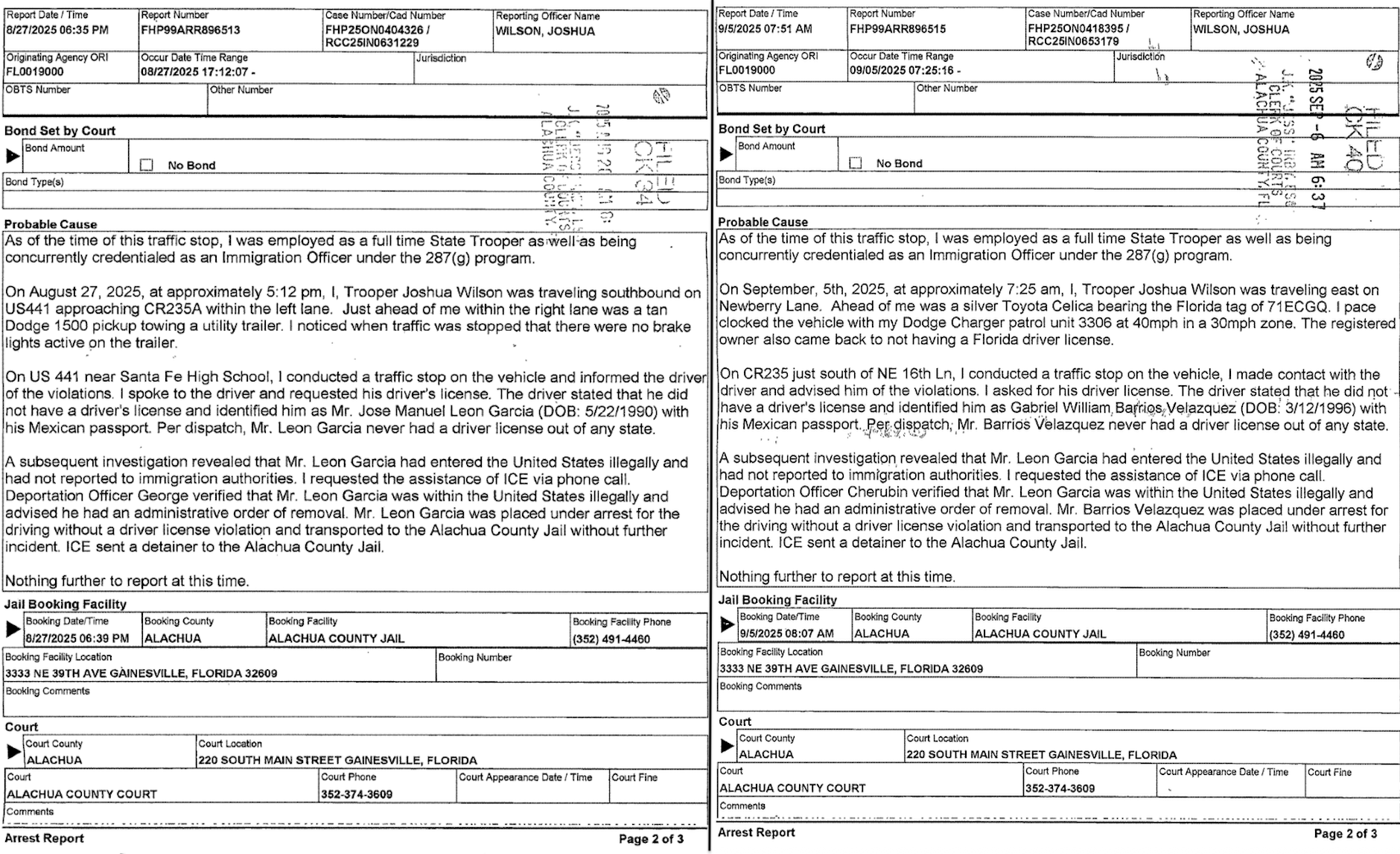 Wilson continues, “I requested the assistance of ICE via phone call. Deportation Officer George verified that Mr. Leon Garcia was within the United States illegally and advised he had an administrative order of removal. Mr. Leon Garcia was placed under arrest for the driving without a driver license violation and transported to the Alachua County Jail without further incident. ICE sent a detainer to the Alachua County Jail.”
