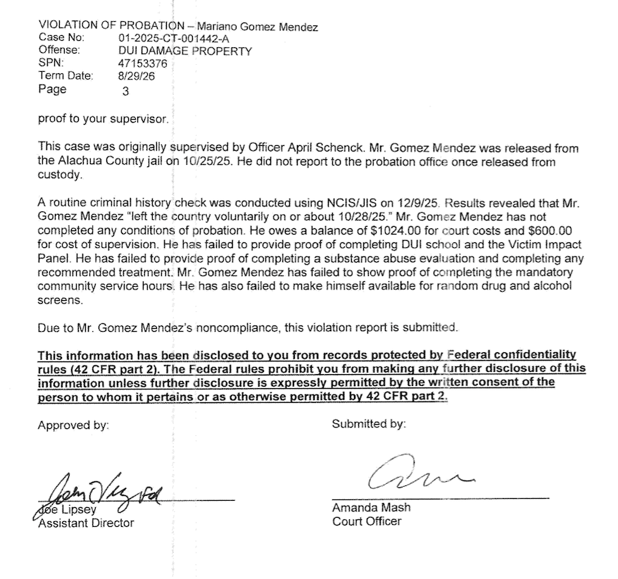 In December 2025, Court Officer Amanda Mash submitted an affidavit of probation violation on Gomez-Mendez. The document states Gomez-Mendez "left the country voluntarily" on or about October 28, 2025, less than a week after he was released from jail after resolving his case.