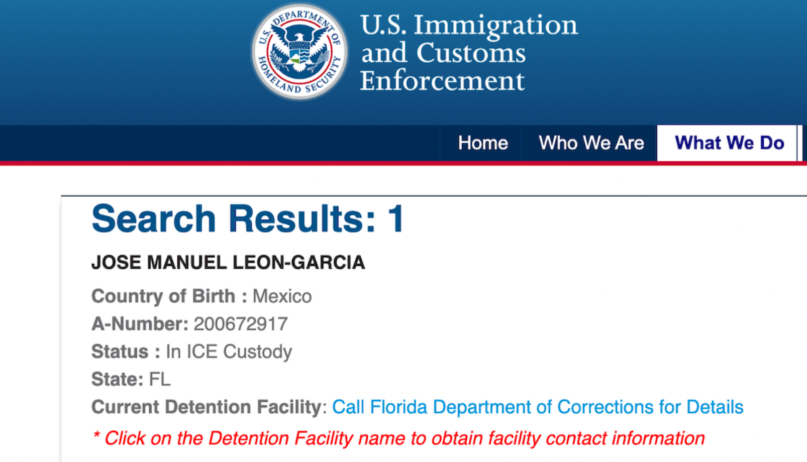Leon-Garcia previously showed up under the ICE Detainee Locator, but it didn’t specify if he was located at any specific detention facility. Presently, he no longer shows up upon searching up his name or A-number.