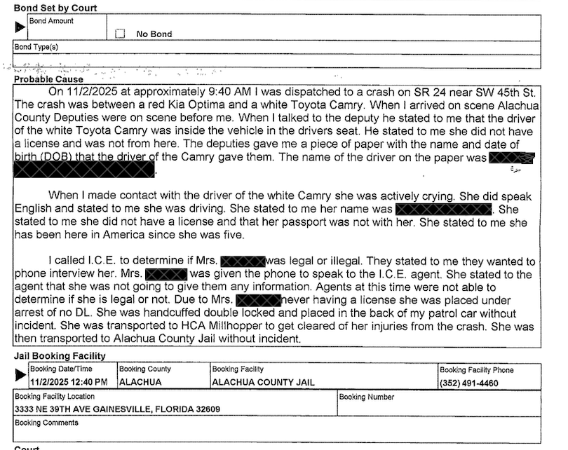 Crandall reported, "Agents at this time were not able to determine if she is legal or not." Crandall arrested her for driving without a valid license, for which she later took a plea deal and was granted a withheld adjudication. Court records show she was not placed under an ICE hold and she was released from jail after posting a $150 bond.