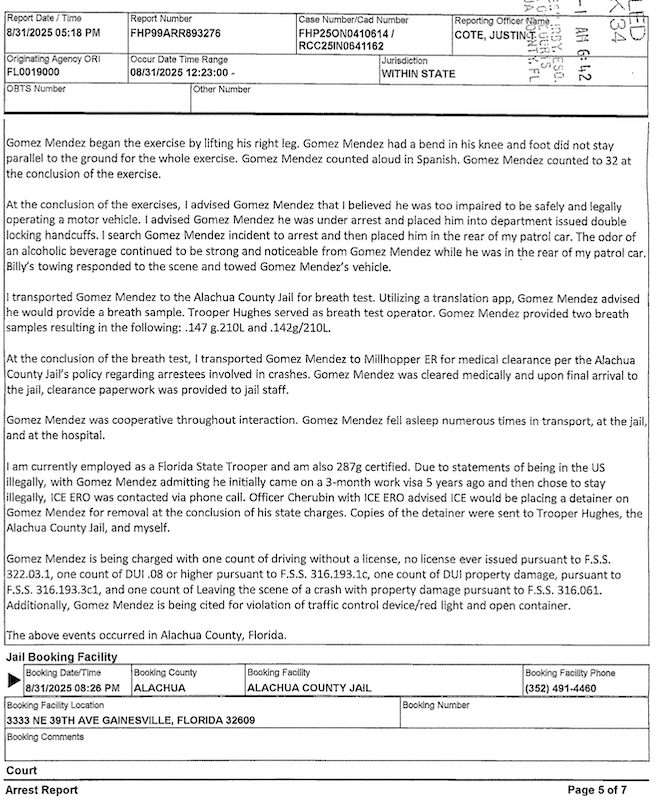 Cote’s report continues, “Gomez-Mendez was cooperative throughout interaction. Gomez-Mendez fell asleep numerous times in transport, at the jail, and at the hospital. I am currently employed as a Florida State Trooper and am also 287g certified. Due to statements of being in the US illegally, with Gomez Mendez admitting he initially came on a 3-month work visa 5 years ago and then chose to stay illegally, ICE ERO was contacted via phone call. Officer Cherubin with ICE ERO advised ICE would be placing a detainer on Gomez-Mendez for removal at the conclusion of his state charges. Copies of the detainer were sent to Trooper Hughes, the Alachua County Jail, and myself.”