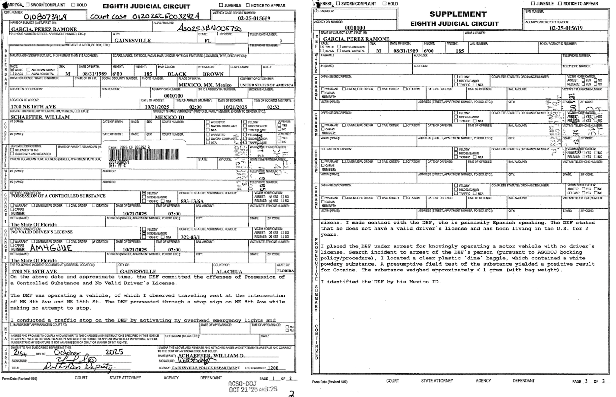 Wilson continues, “I requested the assistance of ICE via phone call. Deportation Officer George verified that Mr. Leon Garcia was within the United States illegally and advised he had an administrative order of removal. Mr. Leon Garcia was placed under arrest for the driving without a driver license violation and transported to the Alachua County Jail without further incident. ICE sent a detainer to the Alachua County Jail.”