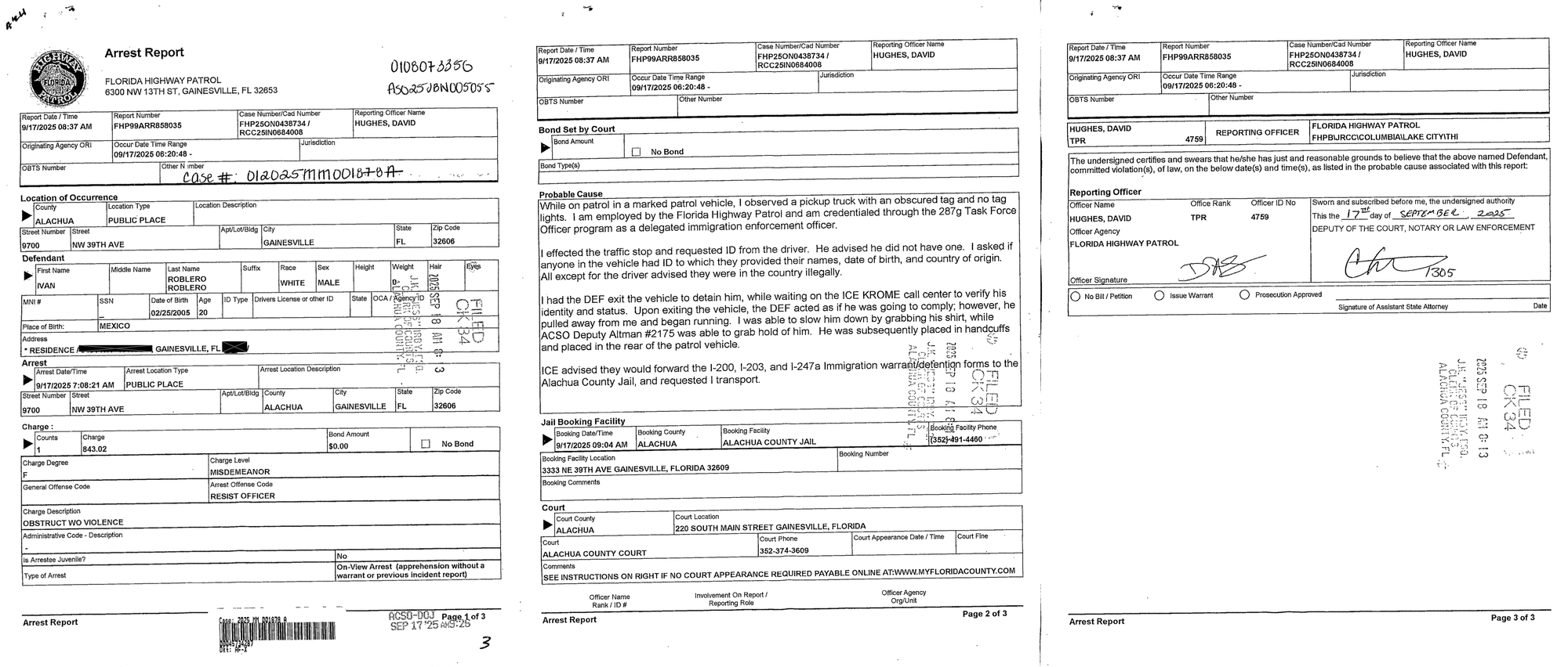 On September 17, 2025, ACSO Deputy Michael Altman physically assisted FHP Trooper David Hughes in arresting Ivan Roblero, who was charged with resisting an officer without violence.