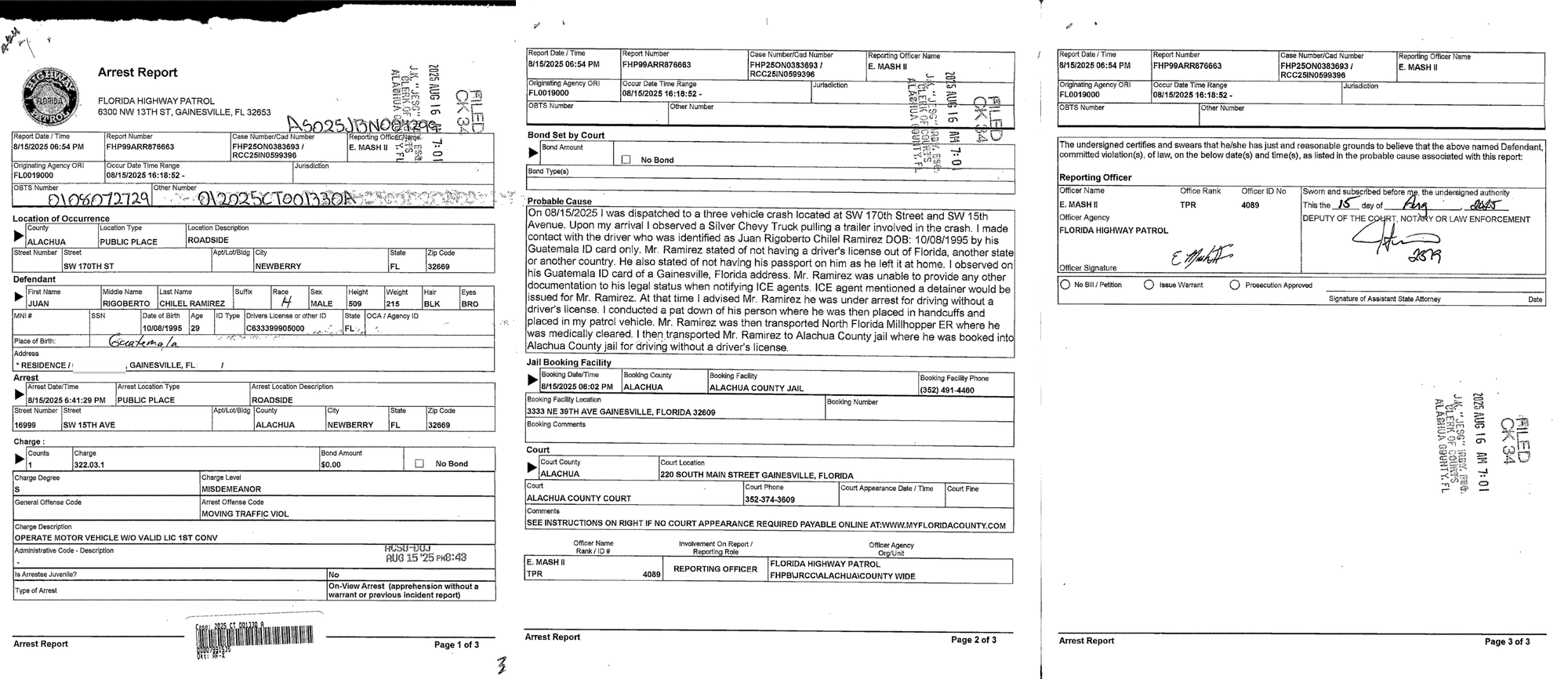 Mash reported, “Upon my arrival I observed a Silver Chevy Truck pulling a trailer involved in the crash. I made contact with the driver who was identified as Juan Rigoberto Chilel Ramirez… by his Guatemala ID card only. Mr. Ramirez stated of not having a driver's license out of Florida, another state or another country. He also stated of not having his passport on him as he left it at home. I observed on his Guatemala ID card of a Gainesville, Florida address. Mr. Ramirez was unable to provide any other documentation to his legal status when notifying ICE agents. [An] ICE agent mentioned a detainer would be issued for Mr. Ramirez. At that time I advised Mr. Ramirez he was under arrest for driving without a driver's license. I conducted a pat down of his person where he was then placed in handcuffs and placed in my patrol vehicle.”