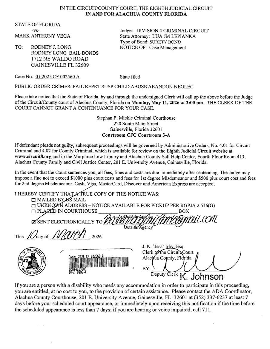 Vega remains out on bond and has a case management hearing set for Monday, May 11.