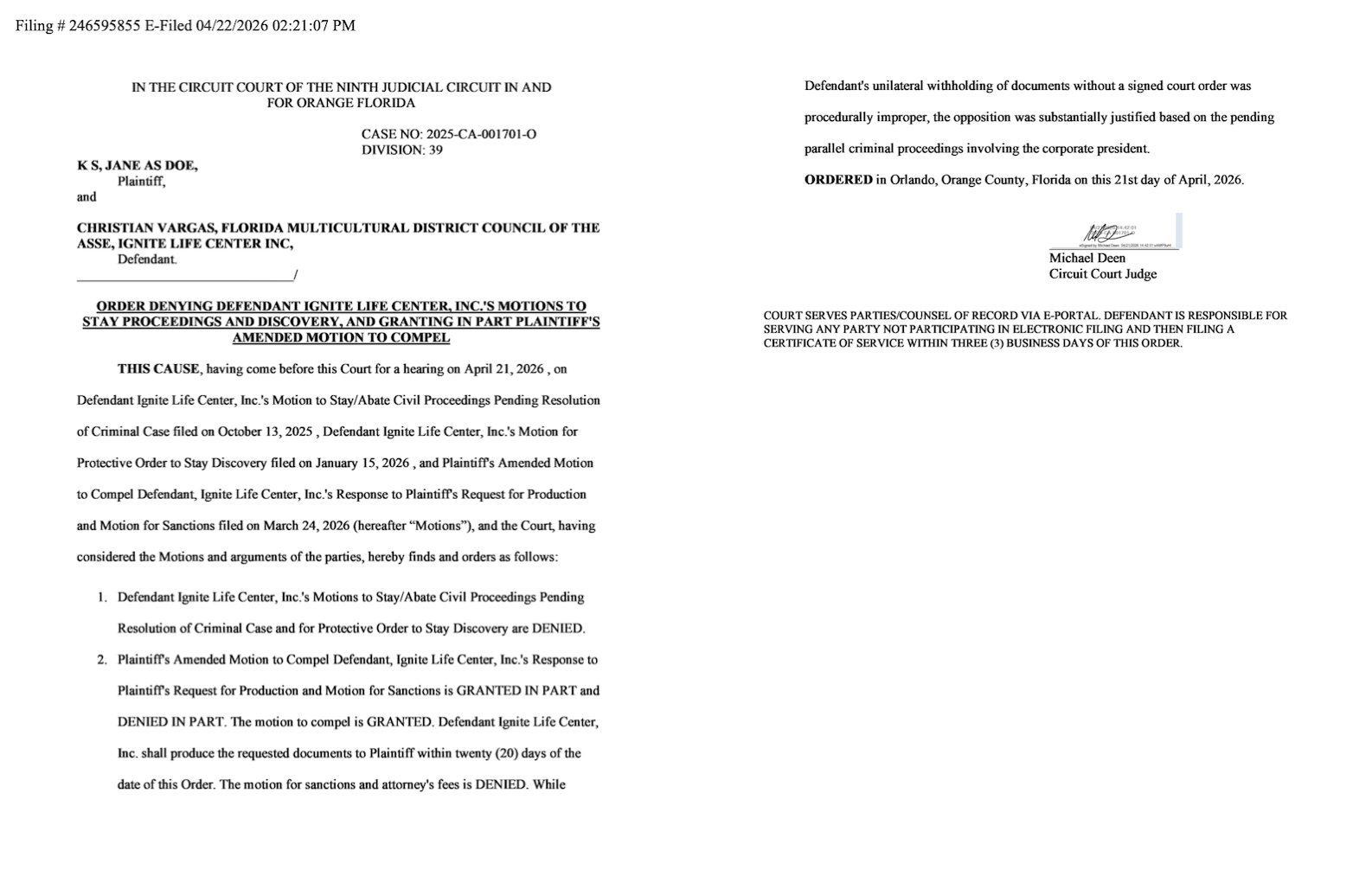 ORANGE COUNTY, FL - Circuit Court Judge Michael Deen has denied Ignite Life Center (ILC) Church’s motions in the ongoing civil lawsuit against them.