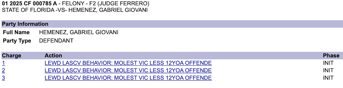 On March 19, 2025, Hemenez was charged with three counts of molestation against a victim under 12 years of age.