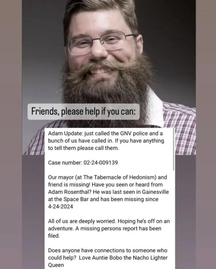 “All of us are deeply worried. Hoping he’s off on an adventure,” stated a missing person’s post when former Gainesville mayor candidate Adam Aruthor Rosenthal, 39, was reported missing in June 2024.