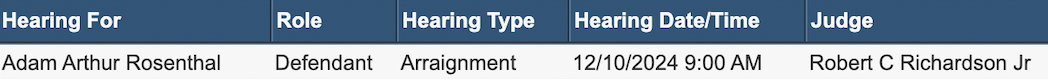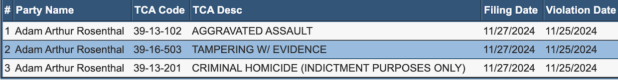 Rosenthal has an arraignment scheduled for his Tennessee homicide case on December 10.