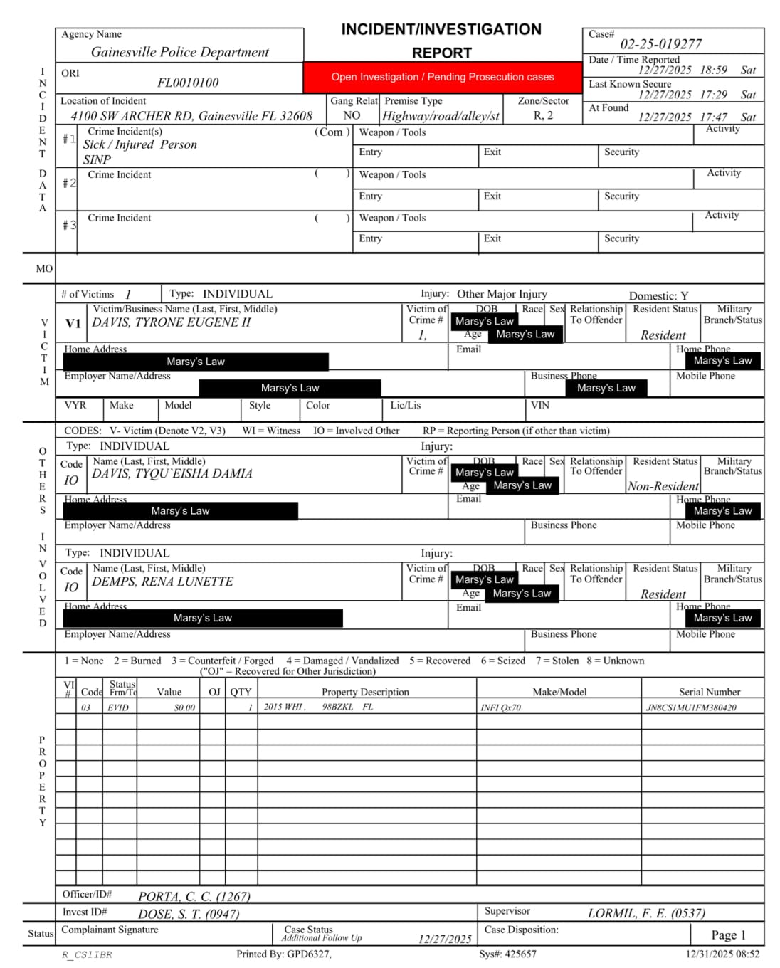 GnvInfo submitted a records request and received a one-page incident report that doesn't contain many details on the incident, as the case is an active investigation.