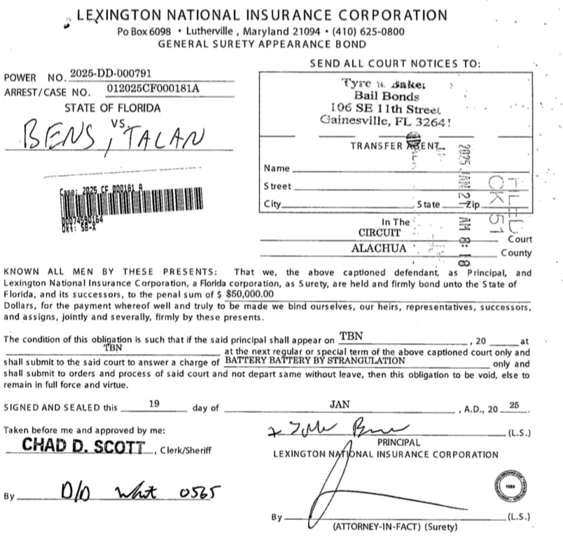 Bens was released from the Alachua County Jail soon after his arrest after posting a $50,000 bond.