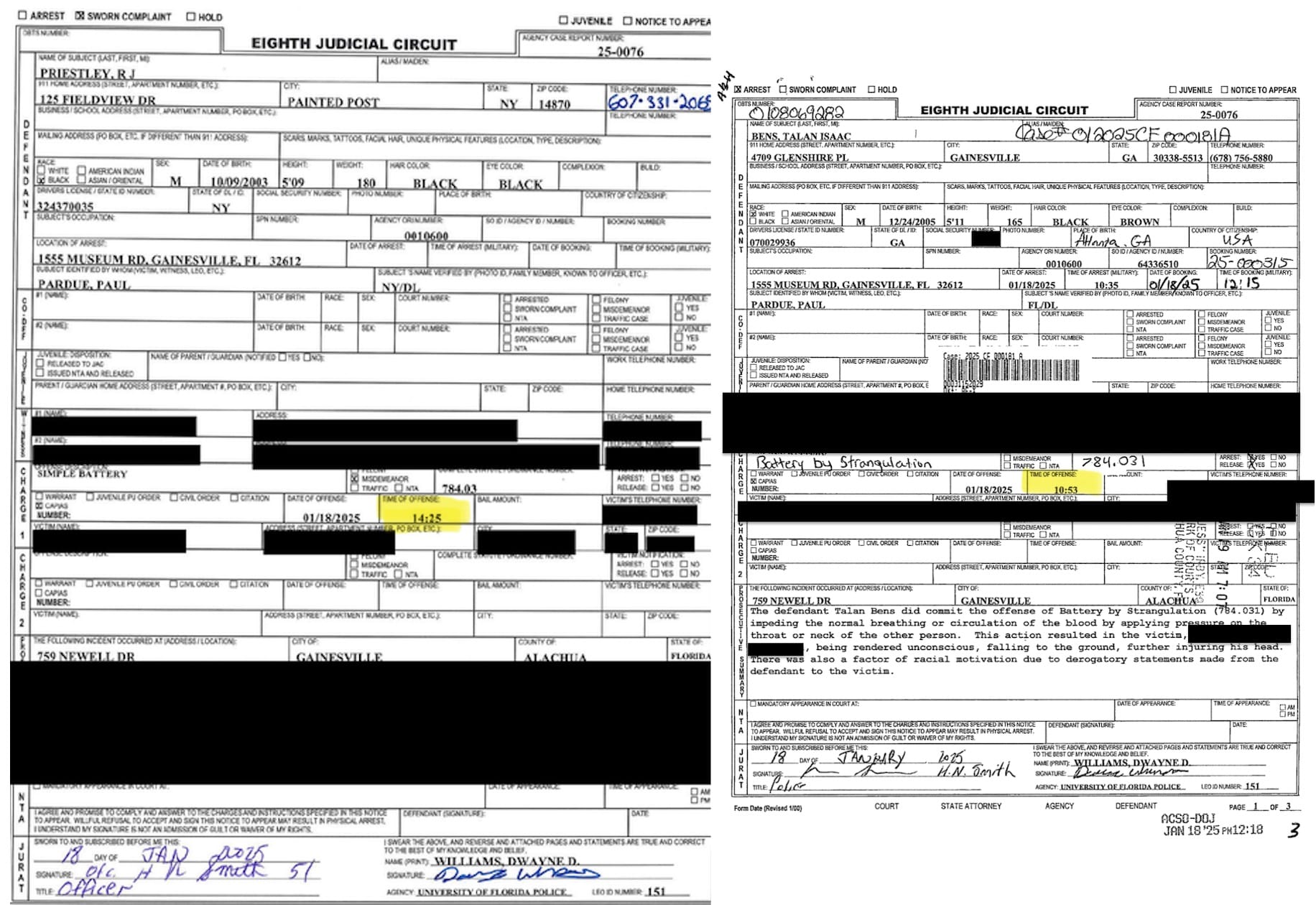 Although they redacted the entire narrative portion of the document, a public records request to UFPD shows they charged Priestley with misdemeanor battery for his role in the incident. However, a search of Alachua County court records indicates a case was never opened against him. There are no search results upon looking his name up in the multiple ways it’s spelled in reports. Additionally, Bens’ and Priestley's reports regard the incident as occurring hours apart.