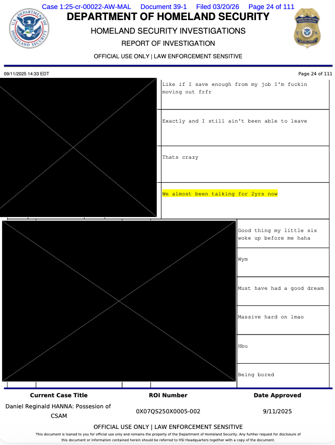 "These are just some examples of Hanna’s online communications with minors," Assistant United States Attorney Adam Hapner wrote to the court ahead of sentencing. "There are many more conversations—over 100—where Hanna likely knew from photographs and other conversations that the other user was a minor but there was not an explicit mention of the user’s age in the messages... These examples are simply intended to demonstrate that Hanna is not merely a passive possessor of child pornography. In addition to maintaining a significant and disturbing collection of CSAM for over a decade, Hanna regularly conversed with minors––sometimes for years—attempting to groom them by introducing them to sexually explicit topics and ideas. Based upon his pervasive sexual interest in children and his willingness to act on that interest by contacting and communicating with minors, Hanna presents a significant danger to the public and should be sentenced accordingly."
