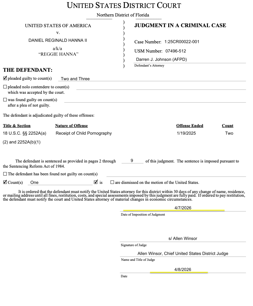 On Tuesday, the United States Attorney's Office of the Northern District of Florida (USAO-NDFL) announced that Daniel Reginald Hanna II, 38, was sentenced to 12 and a half years in prison on charges relating to the possession of child sexual abuse material (CSAM).