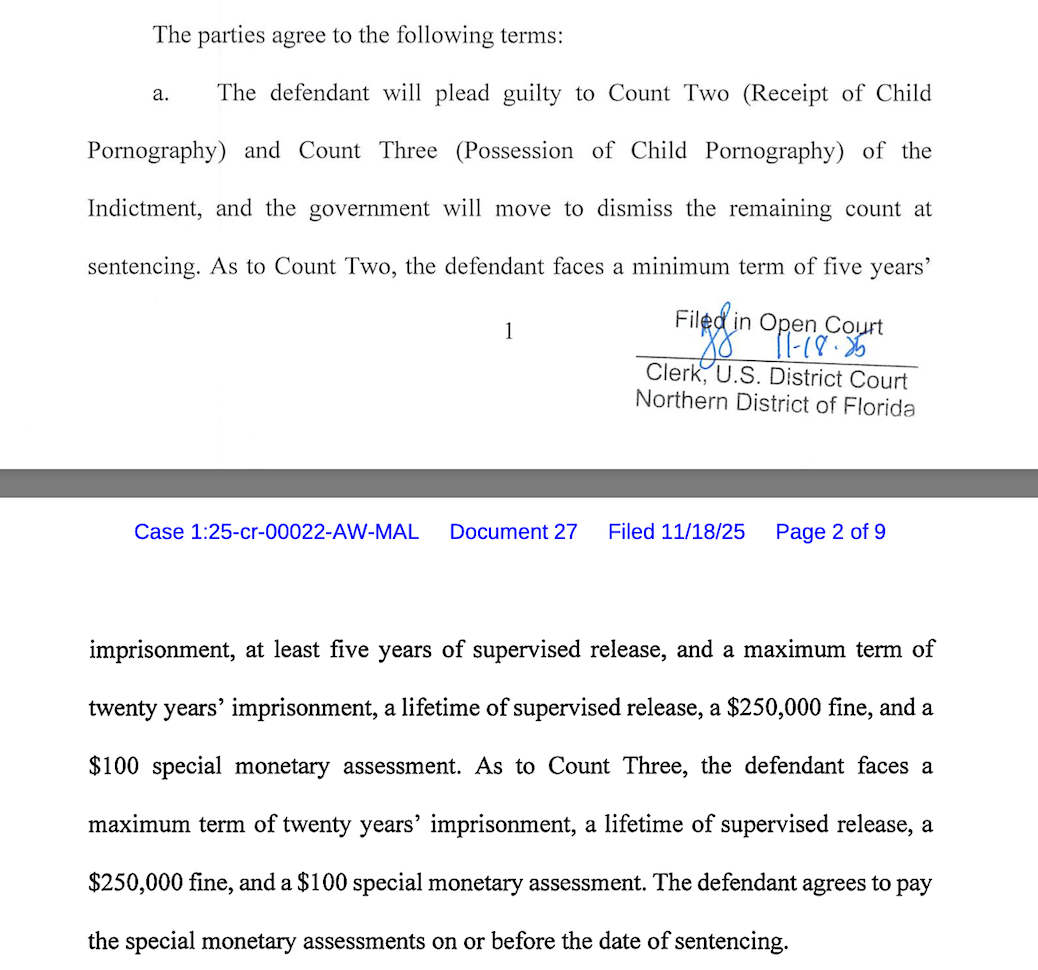 Based on the federal indictment, Hanna was initially facing three charges in federal court. However, as part of a plea deal, the charge relating to the distribution of CSAM was dropped and Hanna pled guilty on the charges relating to receiving and possessing CSAM.