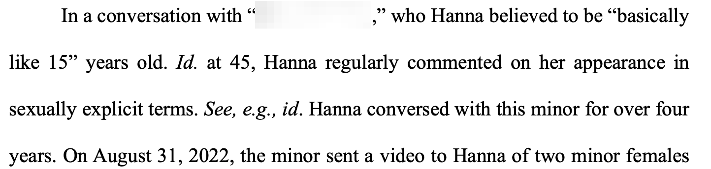 According to the sentencing memorandum, a report details that Hanna "had multiple social media application accounts, such as Snapchat and Tiktok, where Hanna stated he was a minor and was communicating with minors... Hanna’s Snapchat account alone included at least 36 conversations with other users who expressly claimed to be between the ages of 11 and 16... In many of these conversations, Hanna purported to be between the ages of 13 and 17, requested photographs of the minors, and commented on the minors’ appearance... In some of these conversations, Hanna also provided a fake name (i.e., 'Tanner')... While communicating with these minors, Hanna regularly introduced sexually explicit topics."