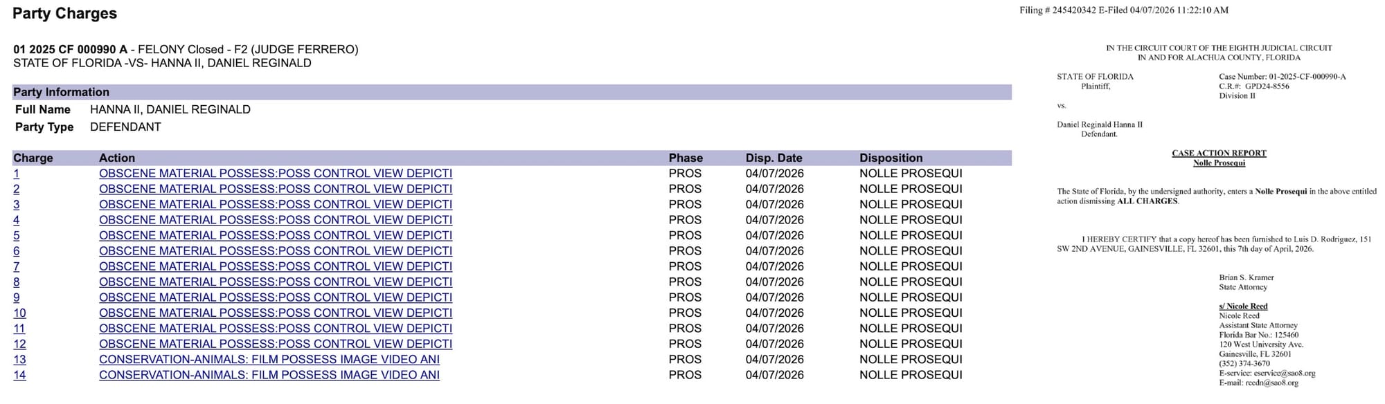 Hanna was also facing over a dozen local charges relating to the possession of CSAM and images or videos of sexual abuse against animals. However, state prosecutors in Alachua County dismissed all of Hanna's local charges shortly before or soon after Hanna was sentenced in federal court.